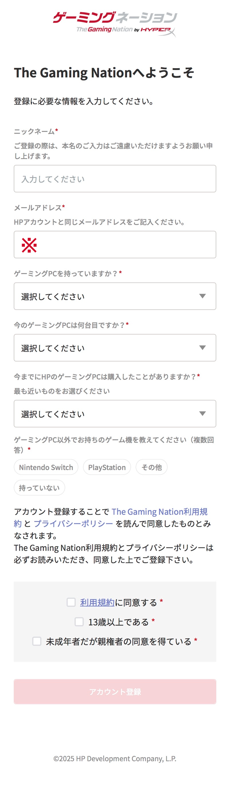HPアカウントの作成は以上で終了となり、この後The Gaming Nationのアカウント作成画面へ進みます。