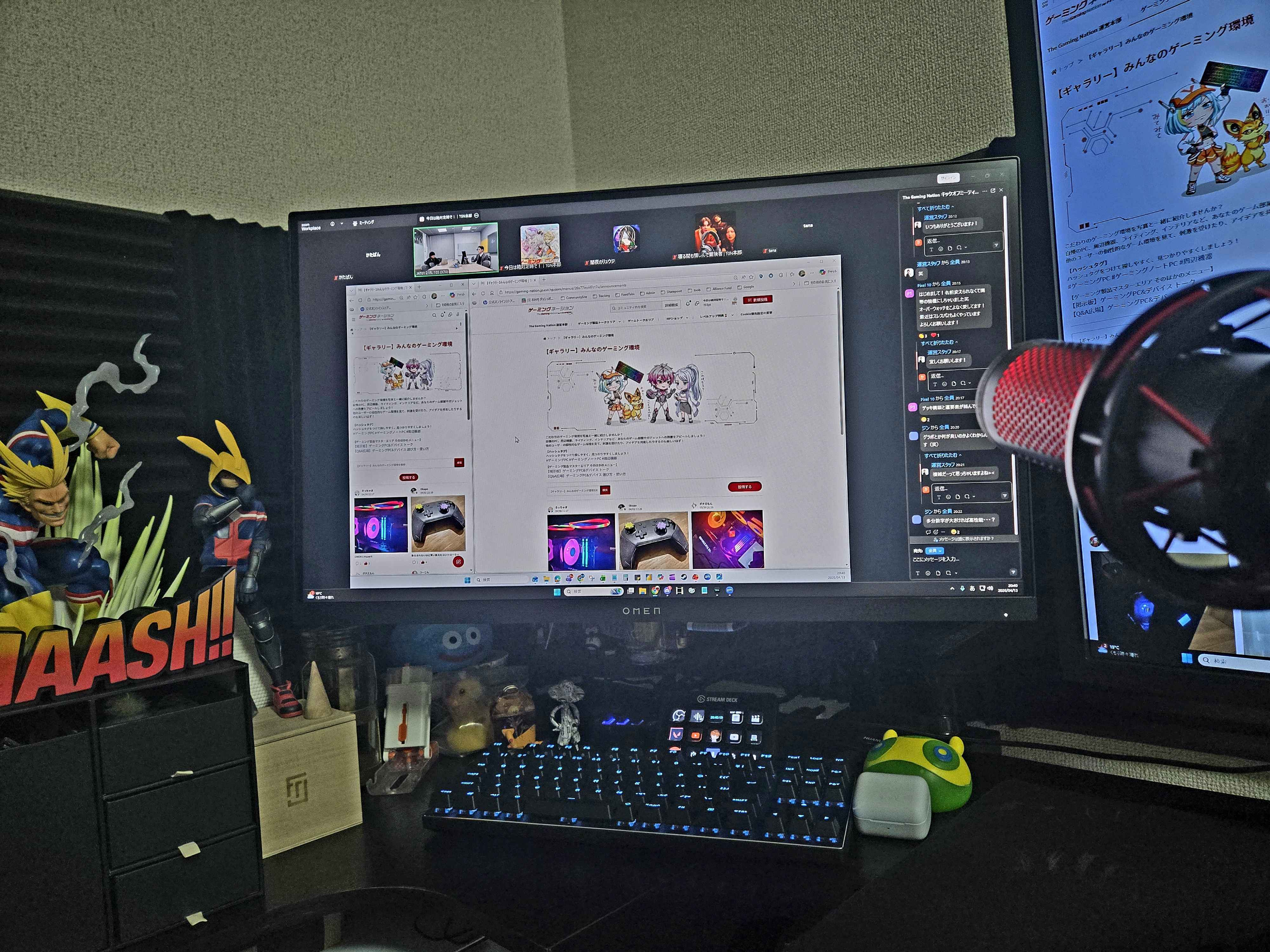 トップ > 【ギャラリー】みんなのゲーミング環境 > オンライン会議中に...パシャリ かたぱん 2026/04/13 20:43 オンライン会議中に...パシャリ プレオープンのオンライン説明会中!記念にー!笑 もしかして...あーしのゲーミング環境....ちょっとごちゃごちゃしすぎ...!? ゲーミングPC 周辺機器 いいね 共有する 共有する X facebook LINE リンクをコピー コメントする 3 件の返信 (新着順) ミュートしたユーザーの投稿です。 投稿を表示 今日は絶対定時で!|TGN本部 TGN本部 2026/04/14 21:28 かたぱんさん、先日のキックオフご参加ありがとうございました! そして記念写真いいですね! お部屋もなんか拠点感出てて好きです。 いいね 返信する ミュートしたユーザーの投稿です。 投稿を表示 スタッフ|TGN本部 TGN本部 2026/04/14 10:59 かたぱんさん、投稿ありがとうございます☺️ プレオープンのオンライン説明会へのご参加も本当にありがとうございます! 迫力あるフィギュア、こだわりのマイク、そして「OMEN」モニターが並んでいて最高にカッコいいです🤩✨また別の角度からのショットもお待ちしていますね🤭 いいね 返信する ミュートしたユーザーの投稿です。 投稿を表示 かたぱん 2026/04/14 17:56 スタッフ|TGN本部 こちらこそ昨日は誠にありがとうございました!✨ 次は自慢のOMEN PCが写るように撮ってみます!笑 いいね 返信する ミュートしたユーザーの投稿です。 投稿を表示 寝る間も惜しんで冒険者|TGN本部 TGN本部 2026/04/13 20:46 わーい、OMENもHyperXも発見です!ありがとうございます! と、いいつつ、一番にオールマイトとザ・クロウラーに目が行きました(かっけぇ) いいね 返信する ミュートしたユーザーの投稿です。 投稿を表示 かたぱん 2026/04/13 20:48 寝る間も惜しんで冒険者|TGN本部 ありがとうございます!✨ オールマイトもクロウラーも存じ上げていて、 注目してくださって最高に嬉しいです!笑 いいね 返信する